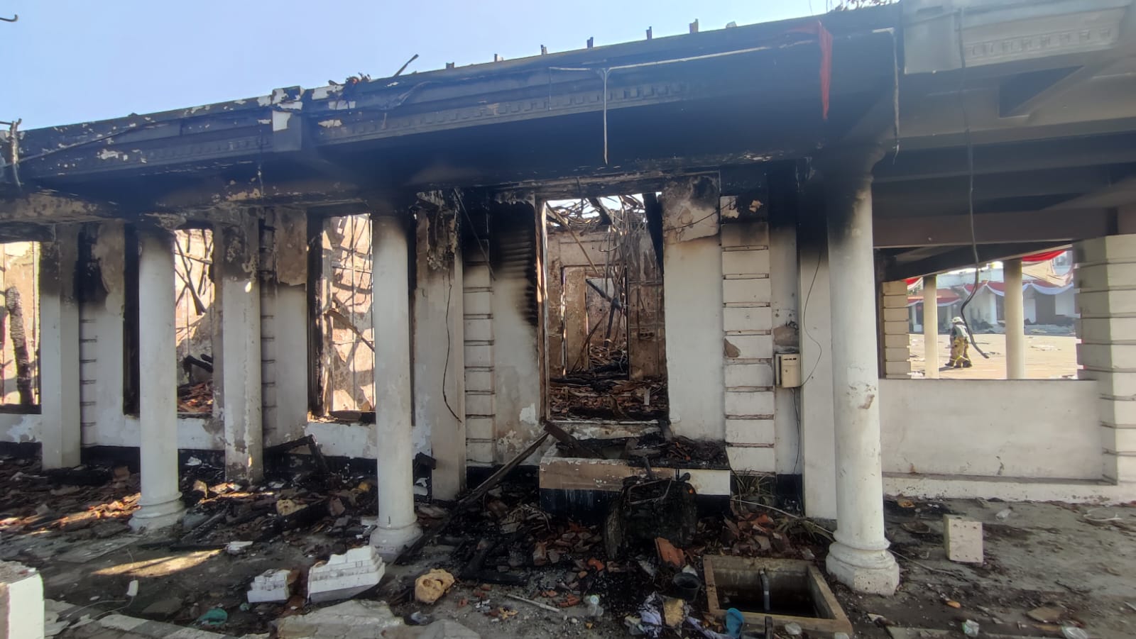 Beberapa bagian atap roboh. Sementara tiang-tiang penyangga tampak gosong. Seolah menjadi saksi bisu amarah massa yang membara.