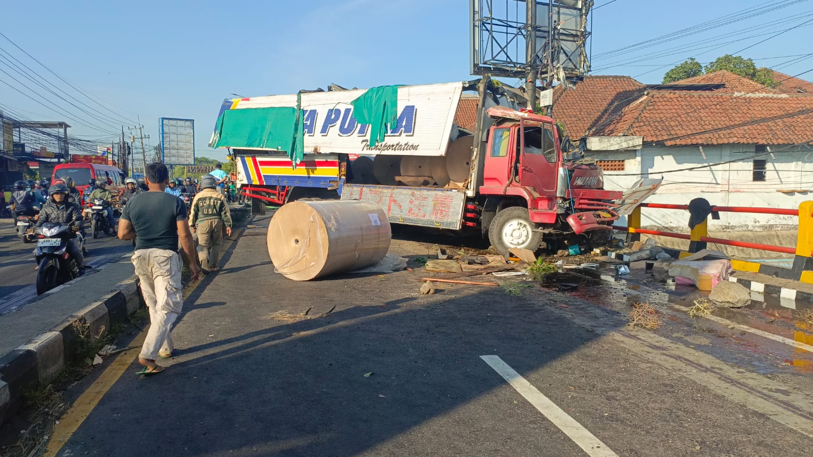Sehingga sang sopir tidak bisa mengendalikan laku kendaraan pada saat jalanan turun ditambah muatan roll kertas yang berat.