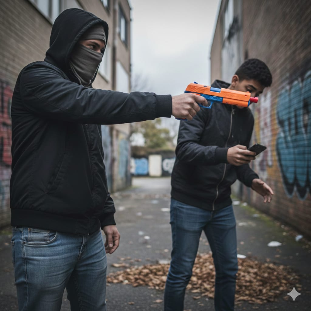 Dari tangan pelaku, polisi menyita sejumlah barang bukti berupa satu unit pistol warna hitam yang ternyata diketahui hanya mainan, satu unit iPhone 15 Pro beserta kotaknya, sepeda motor yang digunakan pelaku, jaket hitam-biru, serta masker.