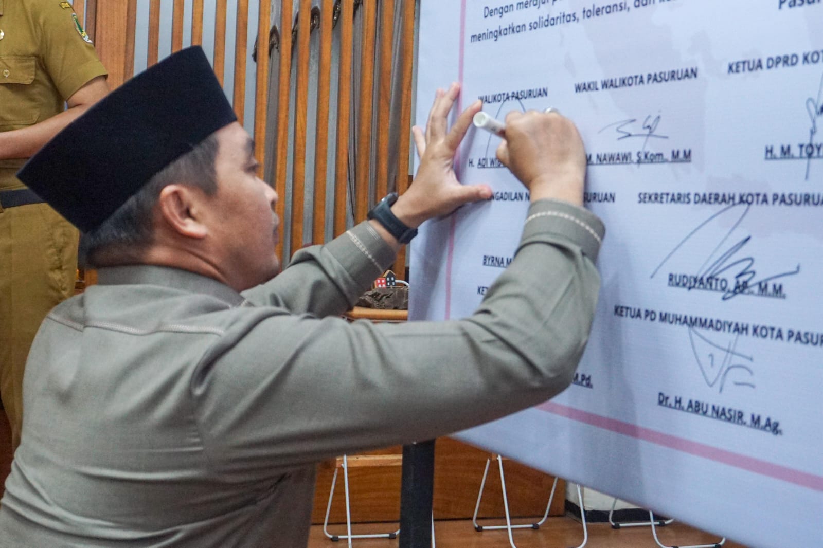 Penandatanganan deklarasi dilakukan oleh jajaran pimpinan daerah Kota Pasuruan. Antara lain Wali Kota Pasuruan, Wakil Wali Kota, Sekretaris Daerah, Ketua DPRD, Kapolres, Kepala Kejaksaan Negeri, Komandan Kodim, Ketua Pengadilan Negeri, Kepala Kemenag, Ketua MUI, Ketua FKUB, serta pimpinan organisasi masyarakat dan akademisi perguruan tinggi di Kota Pasuruan.