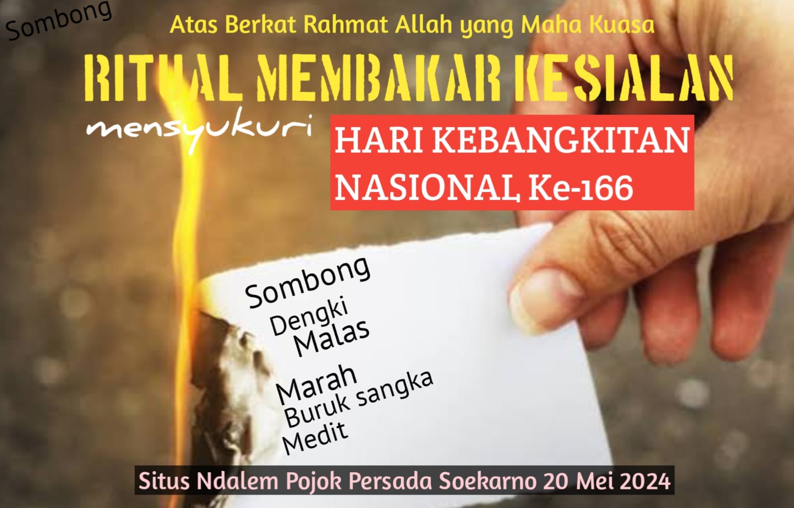 Kegiatan ini bertajuk “Ritual Membakar Kesialan di Hari Kebangkitan Nasional” Ritual ini dimaksudkan untuk menghapus segala sifat-sifat buruk dalam diri agar setiap manusia bisa bangkit.