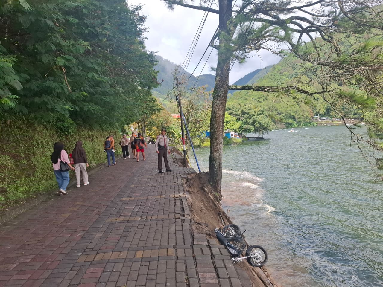 KabarBaik.co – Usai longsor, jalan di wisata Telaga Sarangan di Magetan ambrol. Empat orang dan sejumlah motor tercebur ke dalam telaga (danau) seiring ambrolnya jalan.