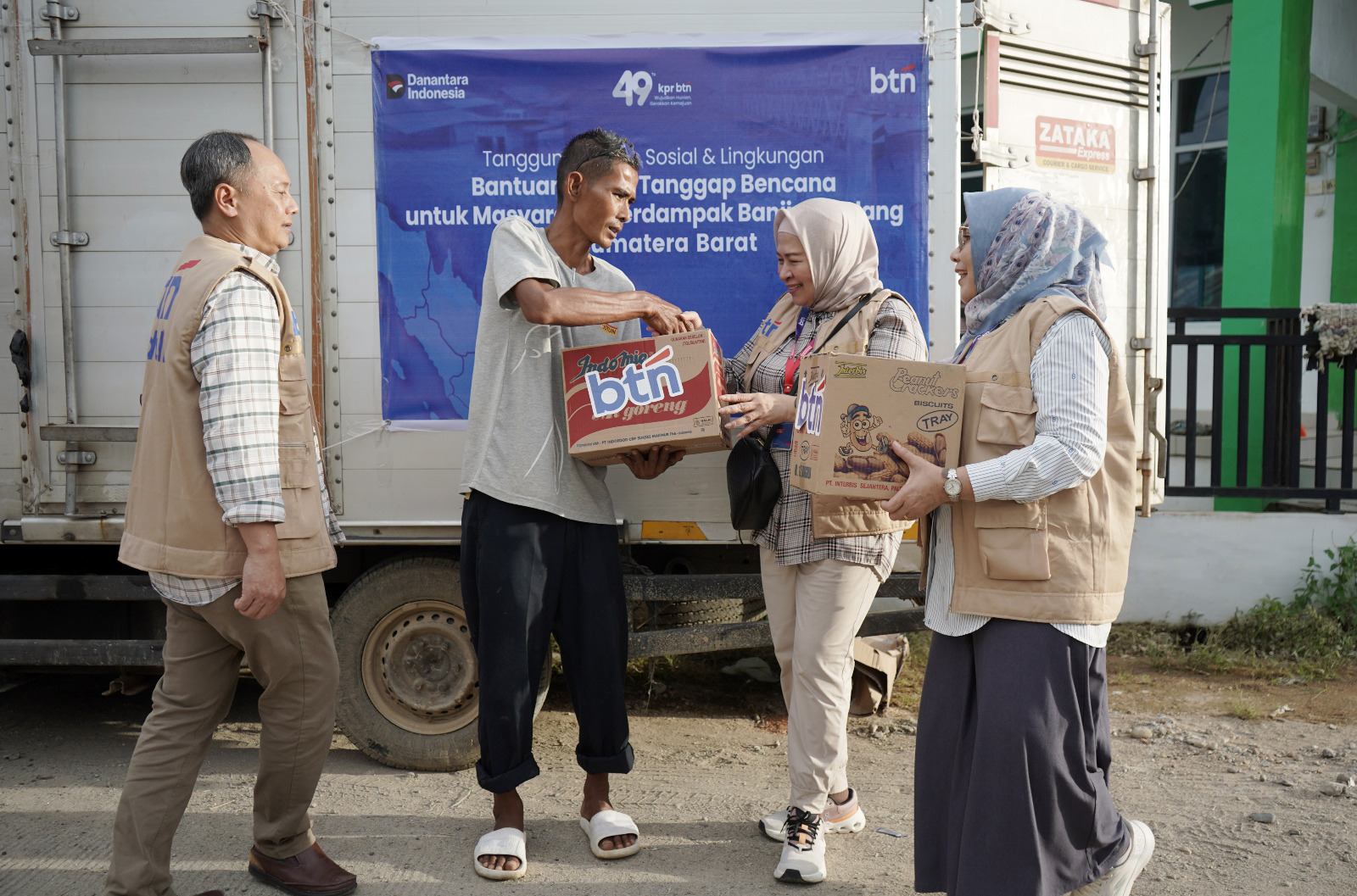 Direktur Commercial Banking PT Bank Tabungan Negara (Persero) Tbk Hermita didampingi Corporate Secretary BTN Ramon Armando, Wakil Kepala Wilayah BTN Sumatera Aries Tuti, dan Kepala Cabang BTN Padang Sudaryanto memberikan bantuan kepada masyarakat yang terdampak banjir di Padang, Minggu (30/11). Selain terjun langsung memberikan bantuan ke masyarakat, BTN juga menyalurkan bantuan untuk korban di Padang melalui Universitas Andalas, Universitas Negeri Padang, Pemerintah Kota Padang, dan Pemerintah Provinsi Sumatera Barat yang memiliki akses langsung ke para korban bencana. Adapun, aksi tanggap bencana BTN tersebut sejalan dengan arahan Danantara untuk bergerak cepat membantu para korban terdampak banjir di Sumatera. Secara total, di Padang, BTN menyalurkan bantuan mencapai lebih dari Rp 2 miliar.