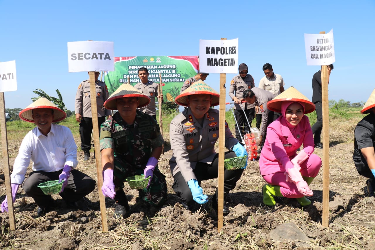 Dalam sambutannya, Kapolres Magetan AKBP Raden Erik Bangun Prakasa menyampaikan bahwa penanaman jagung serentak ini merupakan bentuk kontribusi Polri, khususnya Polres Magetan, dalam mendukung upaya ketahanan pangan nasional.