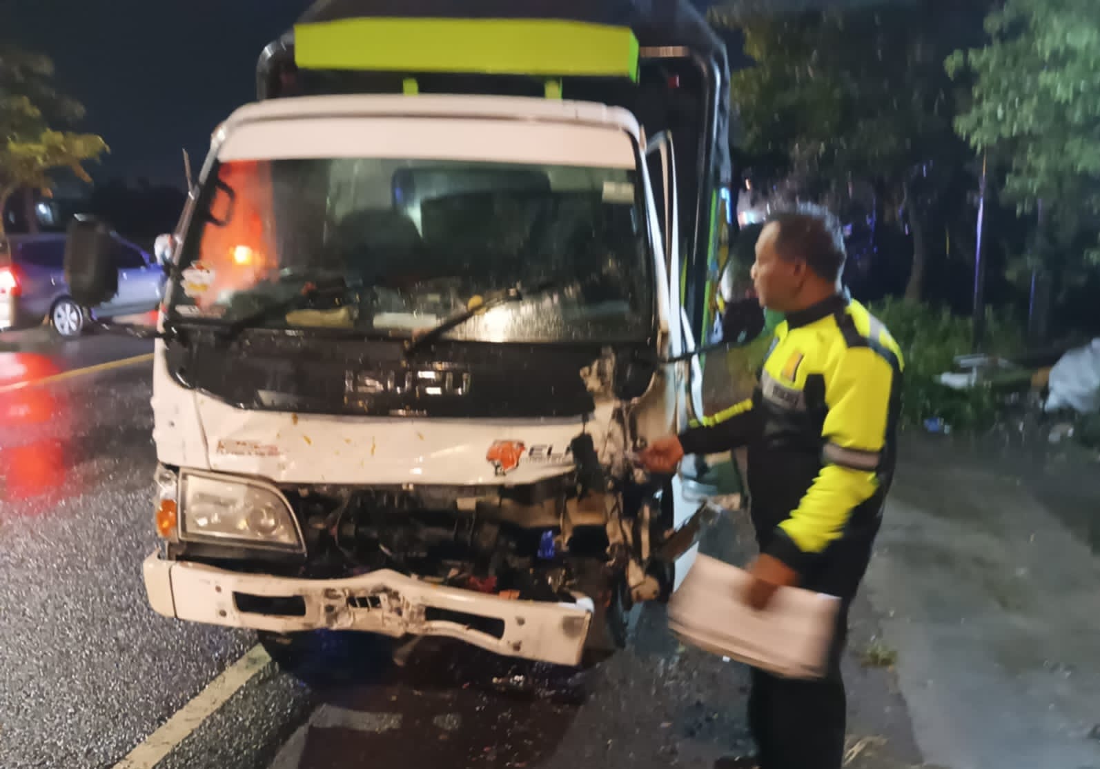 Insiden tersebut melibatkan pick-up Daihatsu Grandmax, truk trailer, dan truk Isuzu Elf. Hujan yang mengguyur kawasan setempat diduga membuat jalan licin dan memperburuk kondisi. “Keadaannya hujan deras. Kejadiannya sekitar jam 18.30, lokasinya dekat Polsek Perak,” ujar Zainul Arif (29), warga sekitar.