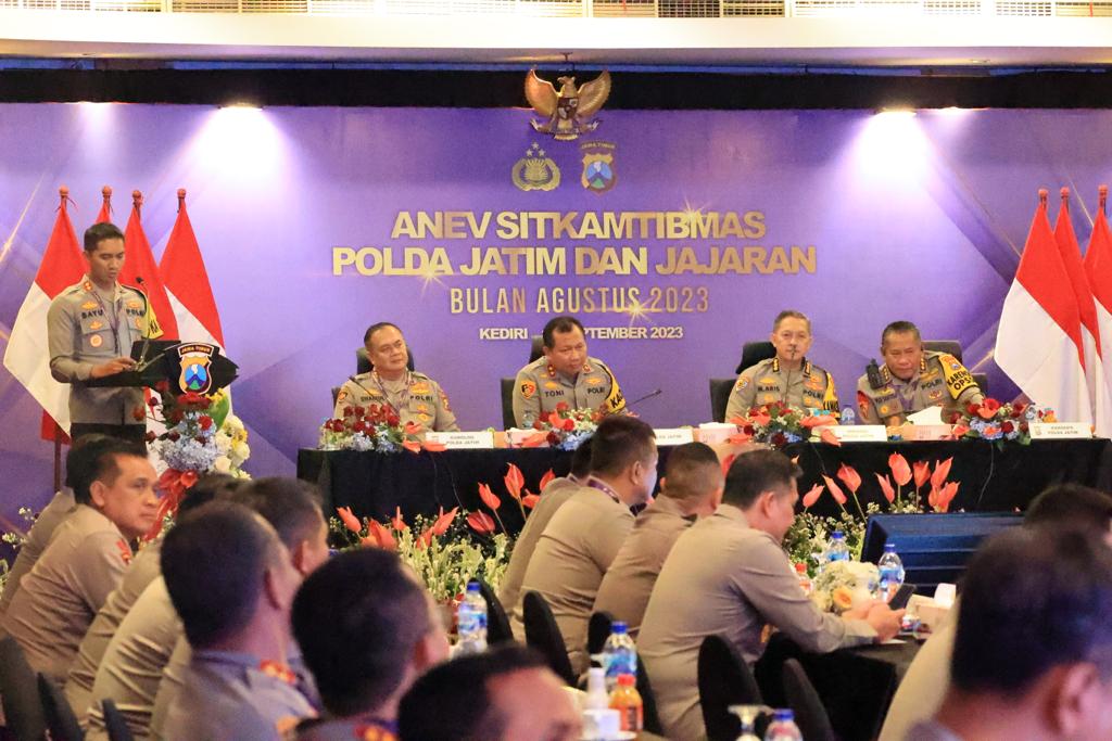 Hal itu seperti disampaikan oleh Kapolda Jawa Timur Irjen Pol Toni Harmanto saat menggelar Analisa dan Evaluasi (Anev) Sitkamtibmas bulan Agustus 2023, di Kota Kediri Jawa Timur bersama para pejabat utama (PJU) Polda Jatim dan diikuti oleh Kapolres/ta jajaran Polda Jatim, Selasa (12/9/2023).
