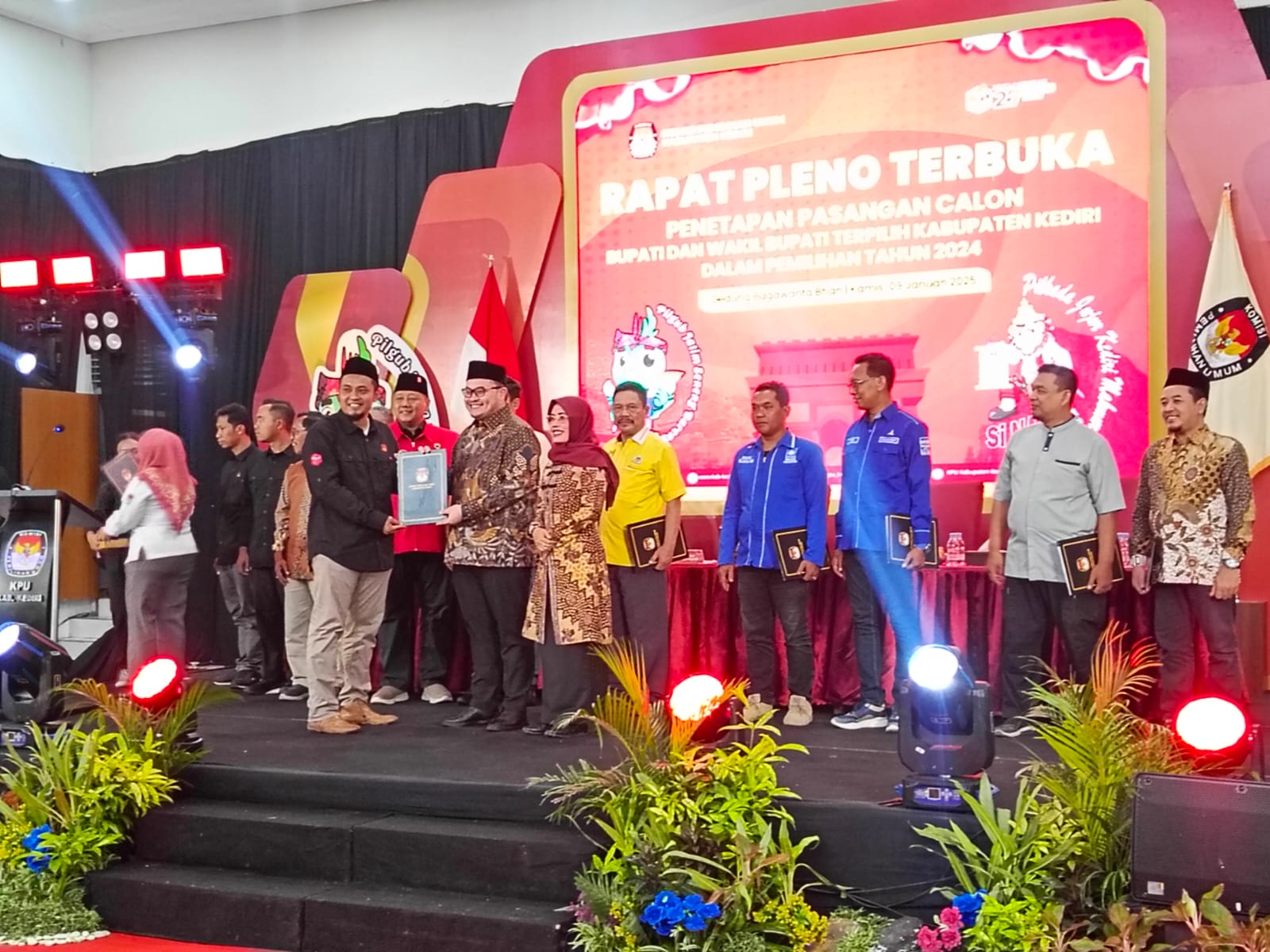 “Menetapkan pasangan calon bupati dan wakil bupati nomor urut 02 Hanindhito Himawan Pramana-Dewi Mariya Ulfa dengan perolehan suara sebanyak 489.900 suara atau 56,53% dari total suara sah sebagai pasangan calon bupati dan wakil bupati terpilih Kediri,” katanya.