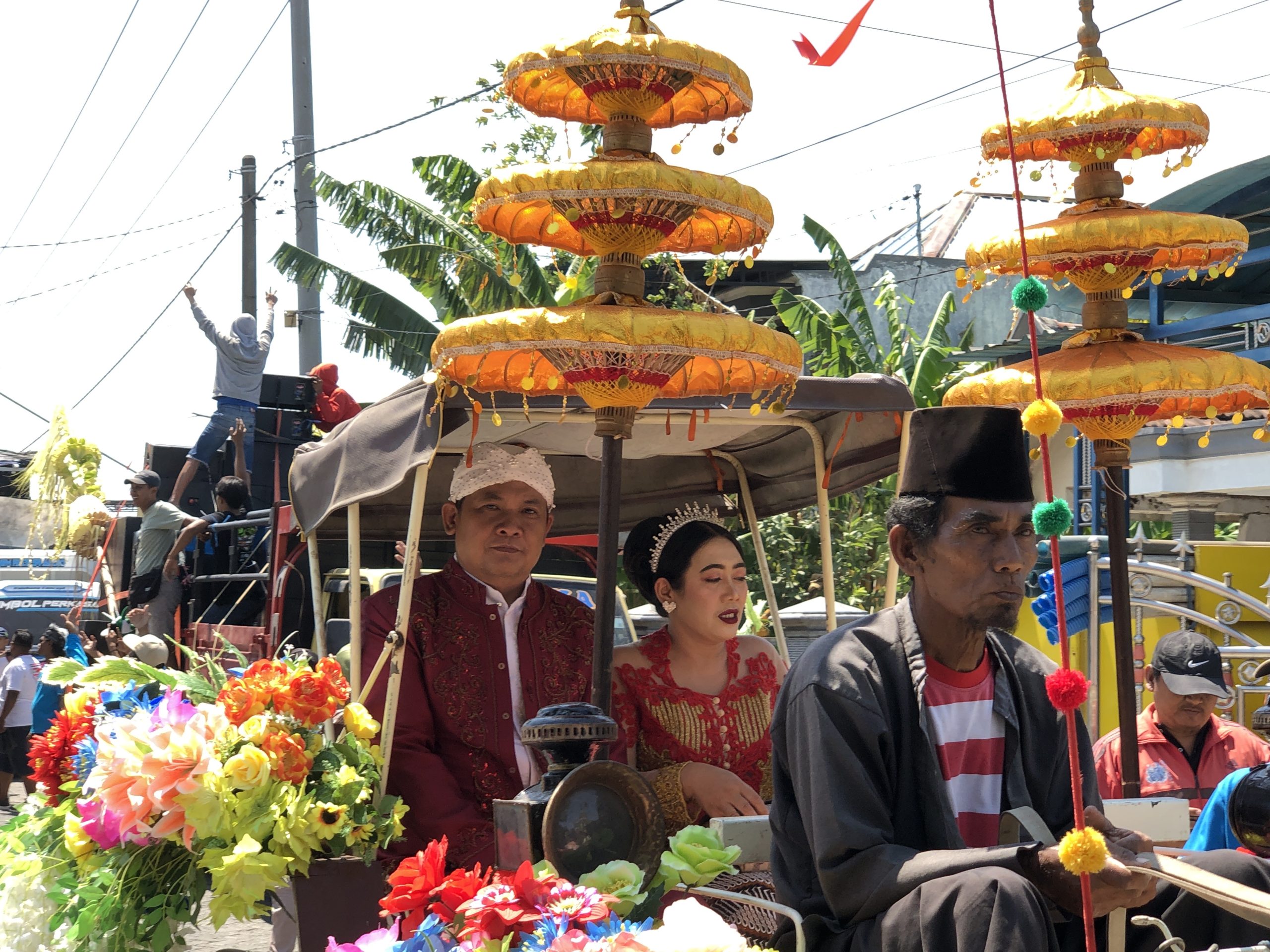 Kades Mojotengah Suharsono bersama istri menaiki kereta kencana dalam Karnaval Sedakah Bumi Dusun Pakupari, Desa Mojotengah, Kecamatan Menganti, Kabupaten Gresik. (Foto: Andika DP)