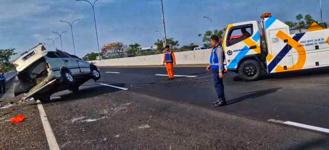 KabarBaik.co – Kecelakaan melibatkan Toyota Kijang LGX terjadi Tol Porong – Sidoarjo. Mobil berwarna silver itu terbalik di KM 766.600/B menyebabkan delapan orang luka cukup serius, termasuk dua balita.