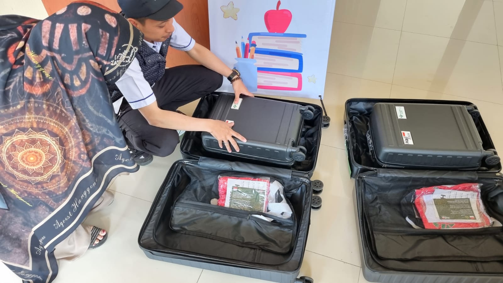 Jemaah Calon Haji (JCH) Kota Batu memeriksa koper dan perlengkapan dari Kemenag Kota Batu. (Foto: Ist)
