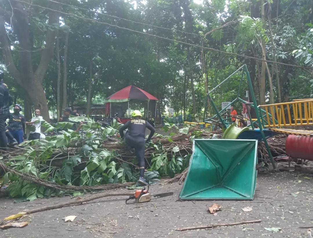 Pascakejadian, petugas dari BPBD Kota Kediri segera melakukan evakuasi dengan memotong bagian pohon yang menghalangi jalan dan menimpa atap warung.