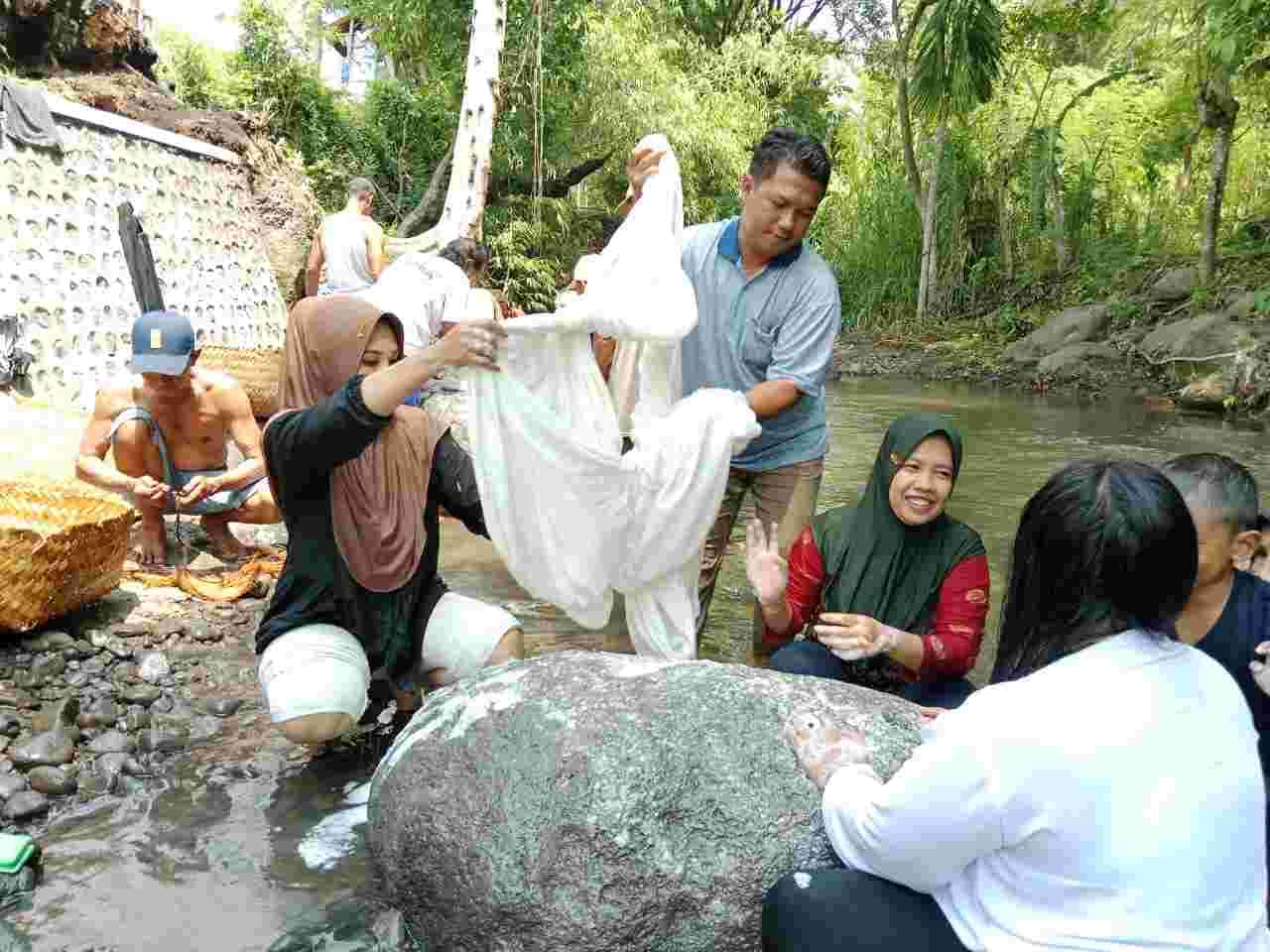 Setelah kain lawon dicuci hingga bersih, warga kembali membawanya ke balai tajuk yang ada di lingkungan Cungking untuk di peras dan airnya ditaruh pada wadah yang disediakan.