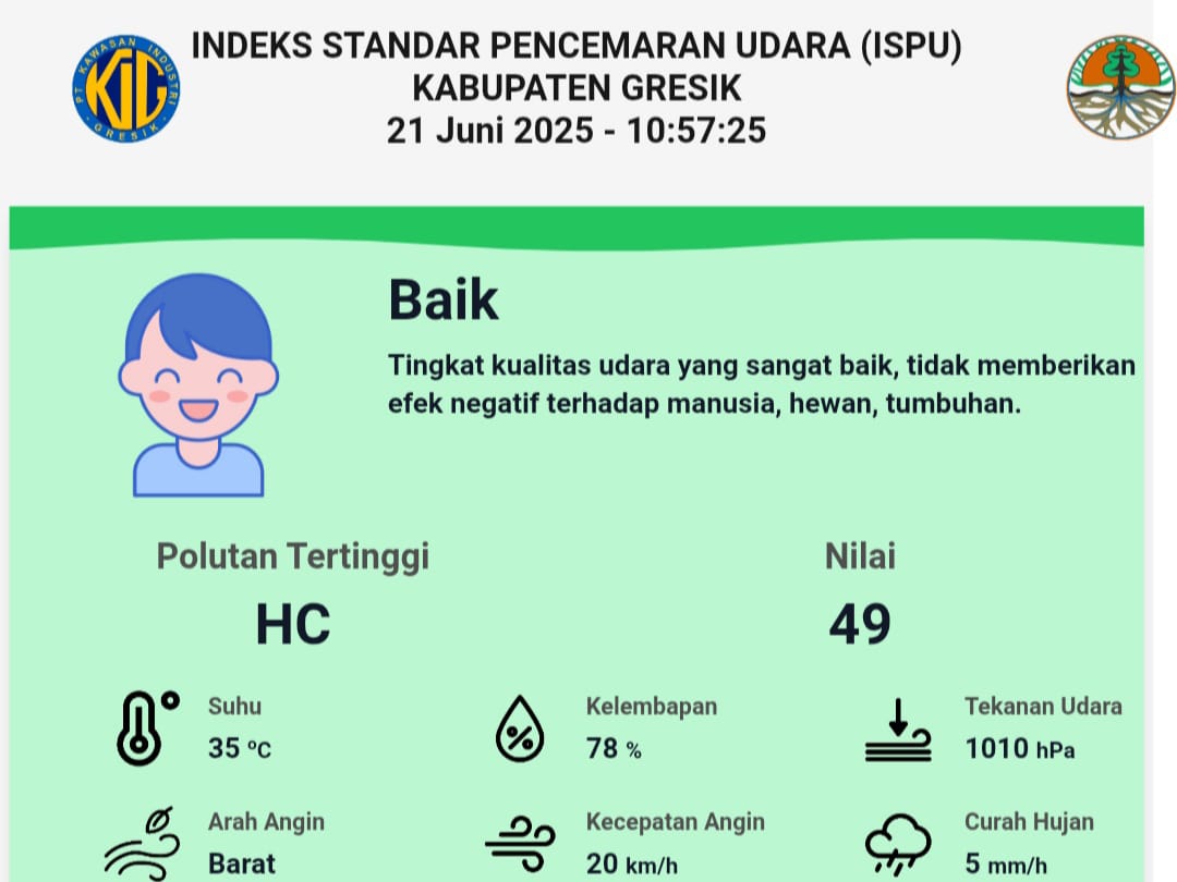 Penegasan itu merujuk pada data pemantauan Indeks Standar Pencemaran Udara (ISPU) yang dilakukan DLH Gresik. Pada 21 Juni 2025, ISPU Gresik menunjukkan angka 49, yang termasuk kategori BAIK. Ia menjelaskan bahwa kualitas udara baru dianggap tidak sehat jika telah memasuki kategori KUNING.