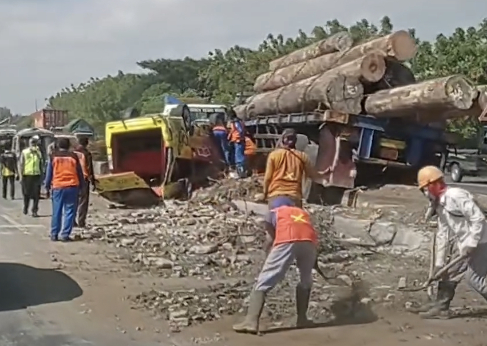 Informasi yang dihimpun, kecelakaan tersebut melibatkan truk trailer bermuatan kayu gelondongan dan mobil elf. Dari gambar yang beredar, truk menyasak median jalan tol, sementara kondisi elf terbalik.