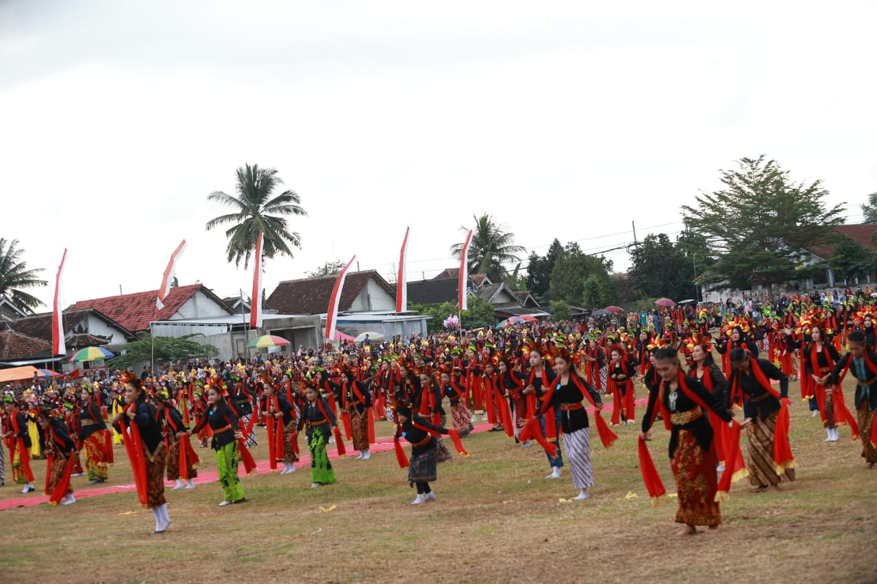 Ribuan masyarakat tumpah ruah mengelilingi lapangan desa sambil menikmati pertunjukan kolosal tersebut.