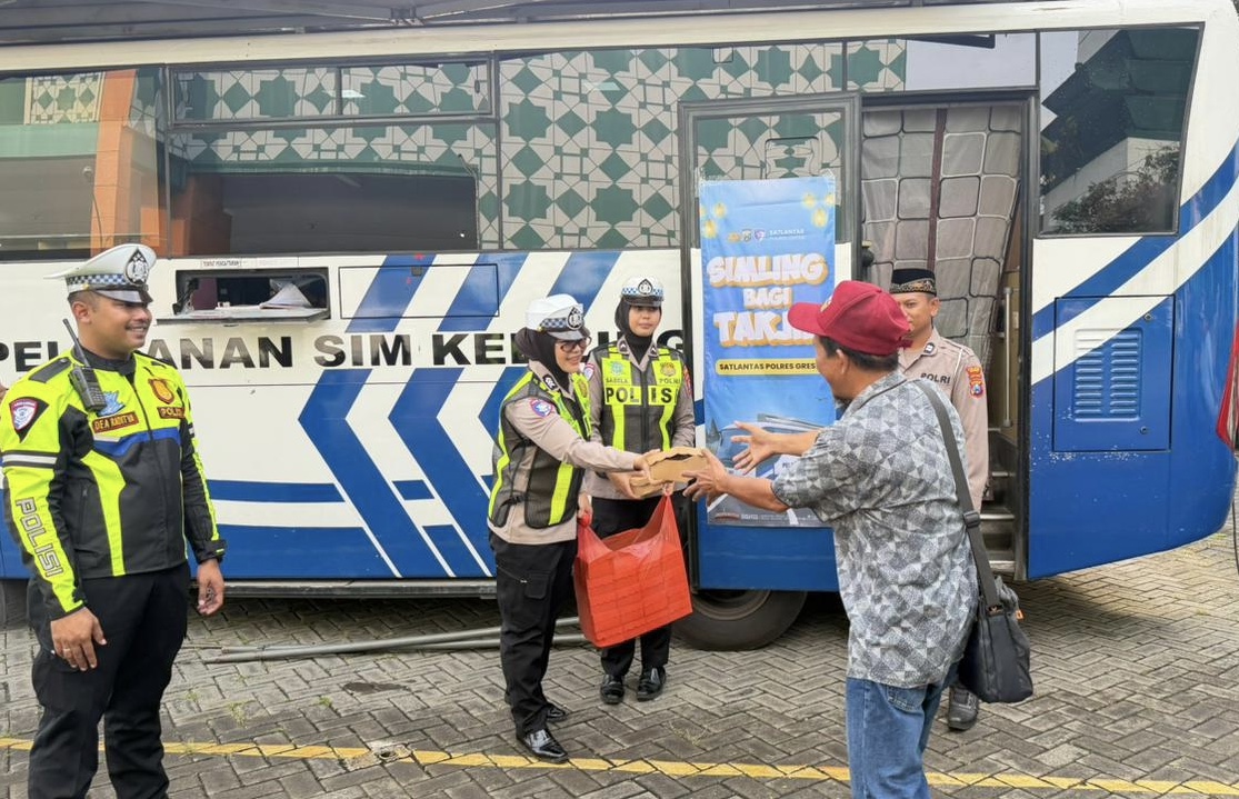 Tak hanya menyediakan layanan administrasi, personel Satlantas Polres Gresik juga membagikan paket takjil gratis kepada para pemohon SIM serta pengendara yang melintas di sekitar area masjid.