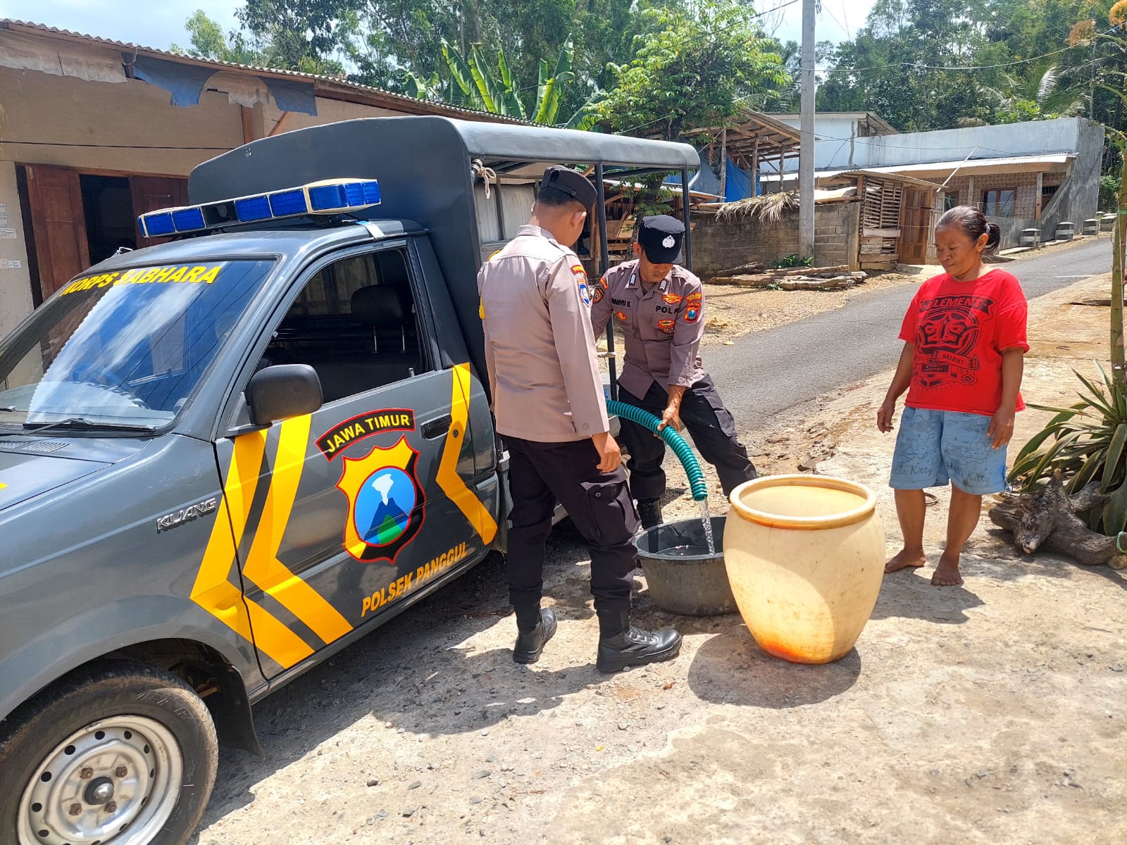 Dengan menggunakan kendaraan patroli yang telah dimodifikasi untuk mengangkut tandon air berkapasitas lebih dari 1.000 liter, anggota Polsek Panggul langsung mendistribusikan air bersih kepada masyarakat. Petugas juga turut membantu warga mengangkut jeriken atau wadah air ke rumah-rumah mereka.