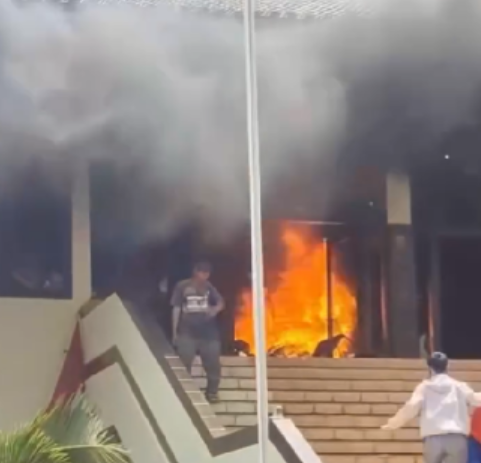 Api pun terlihat mengepul dari dalam gedung. Tak berhenti sampai di situ, dua pos penjagaan juga turut dibakar.