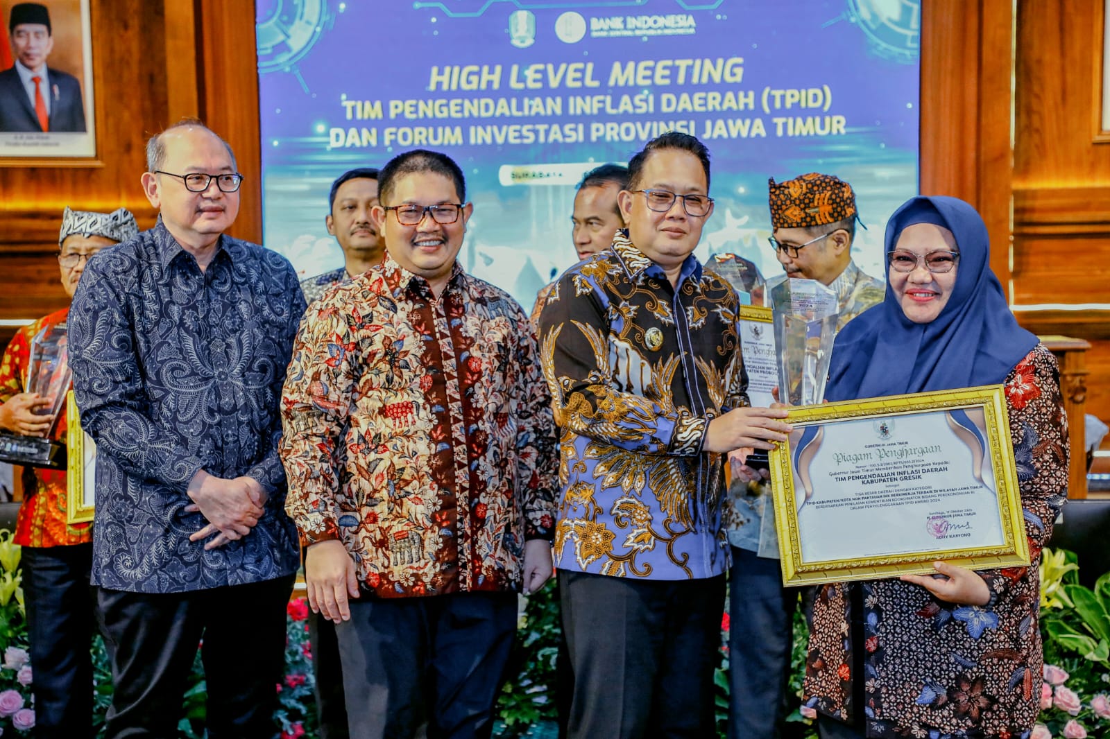 Penghargaan diserahkan langsung oleh Penjabat (Pj) Gubernur Jawa Timur Adhy Karyono, kepada Penjabat (Plt) Bupati Gresik Aminatun Habibah dalam rangkaian TPID Award yang berlangsung di Gedung Negara Grahadi, Surabaya, baru-baru ini.