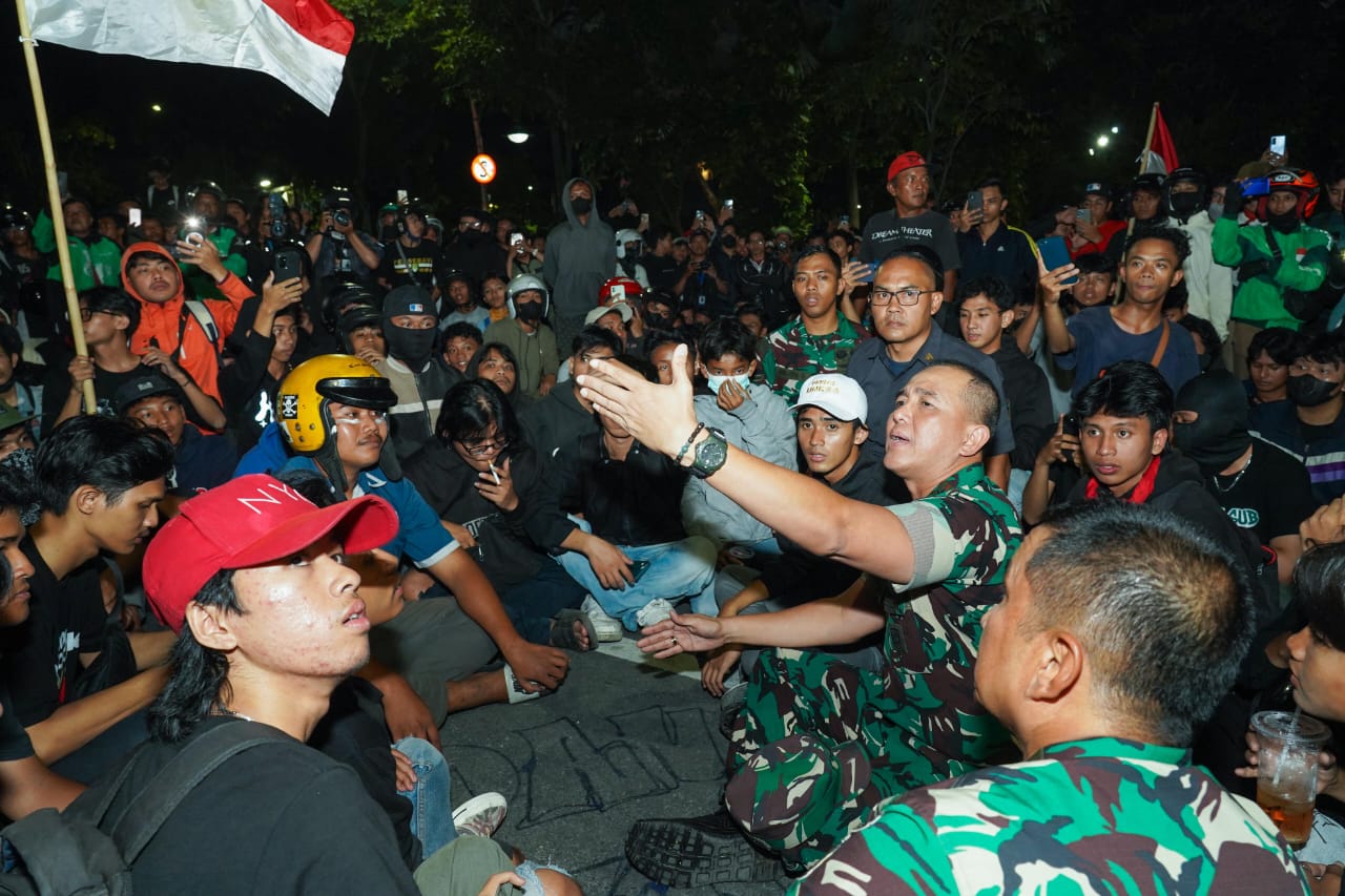 Namun beberapa jam sebelum bara kerusuhan menyala, Pangdam V/Brawijaya Mayjen TNI Rudy Saladin sudah lebih dulu turun langsung menemui massa. “Ijo! Ijo! Ijo!” teriak mahasiswa ketika ia mendekat. Rudy menyambut dengan senyum tenang, mencairkan ketegangan yang sempat membeku.