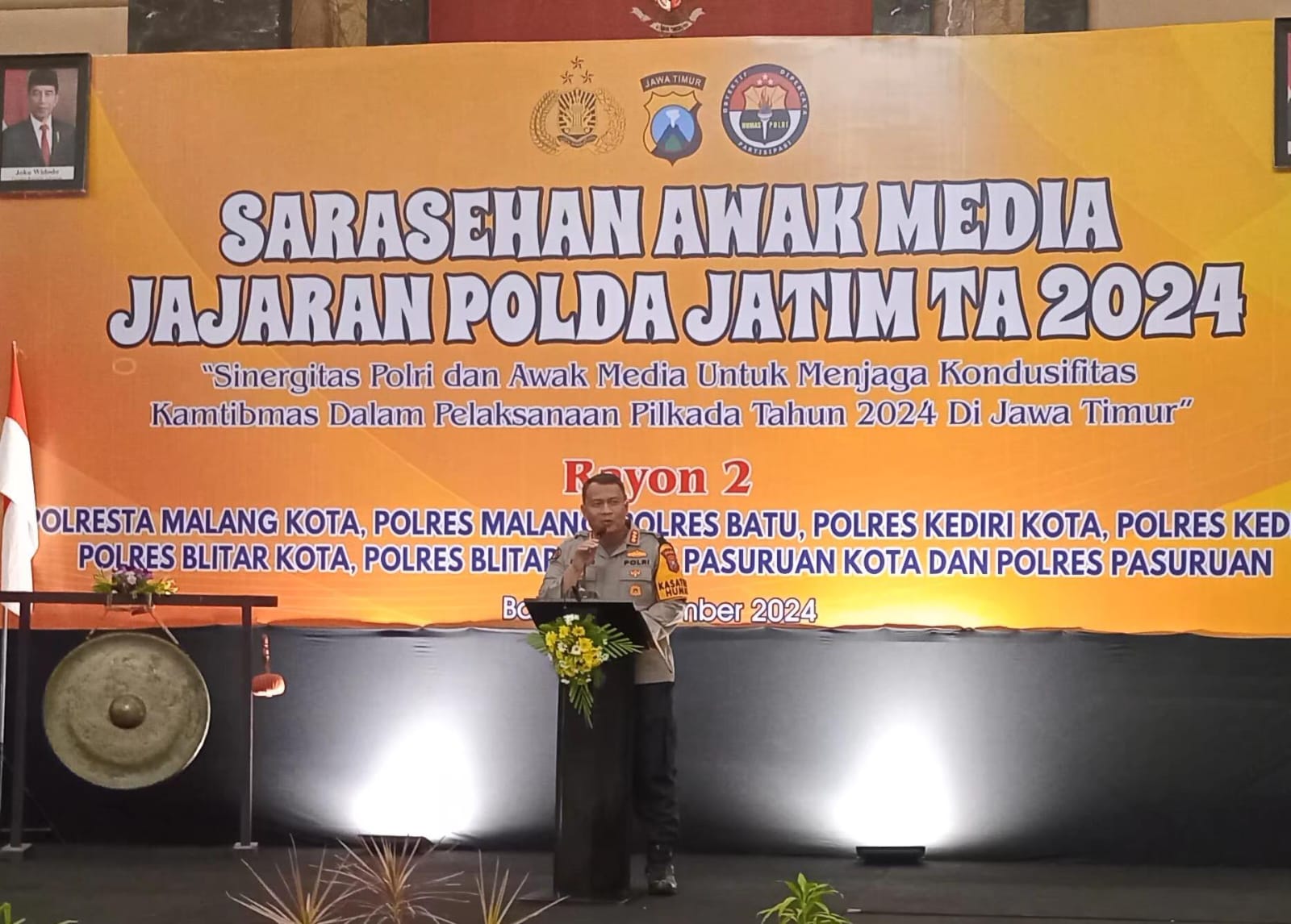 KabarBaik.co – Kabidhumas Polda Jatim Kombes Pol Dirmanto mengingatkan potensi kerawanan selama tahapan Pilkada 2024. Hal ini disampaikan kepada kalangan jurnalis dalam kegiatan Sarasehan Awak Media Jajaran Polda Jatim TA 2024 di Kota Batu, Selasa (3/9).