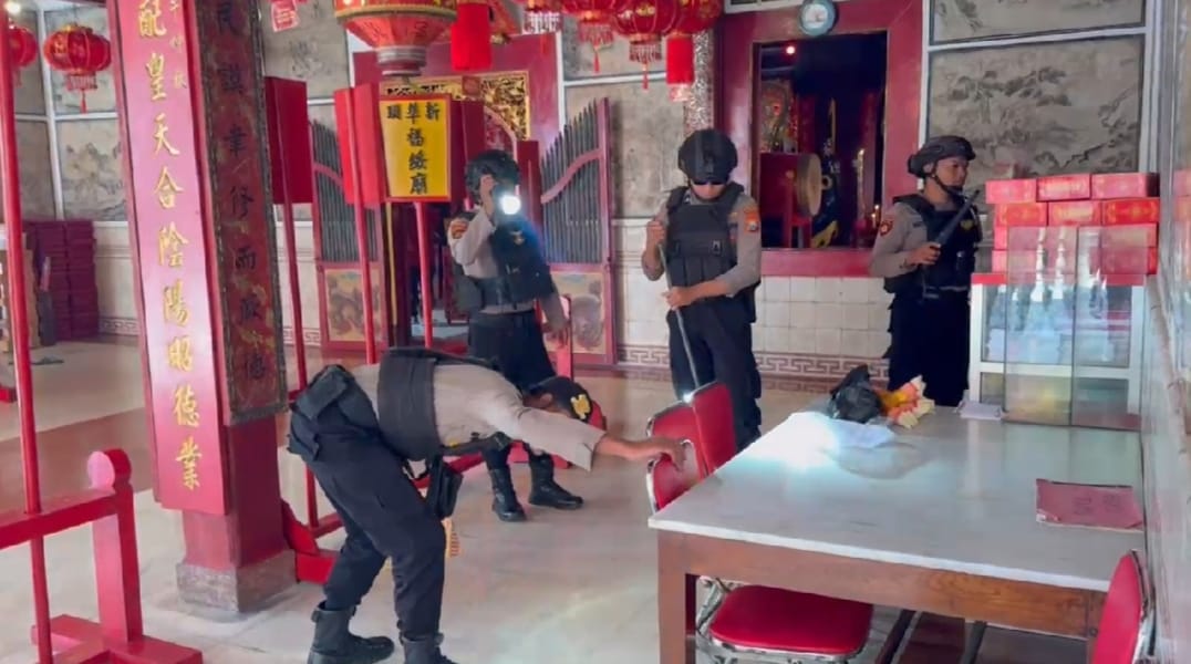 KabarBaik.co – Sejumlah petugas kepolisian dari Polres Bojonegoro menyisir setiap sudut klenteng untuk mencegah hal yang tak diinginkan saat perayaan Imlek Tahun 2576 ini. Langkah tersebut untuk menciptakan rasa nyaman bagi masyarakat Tionghoa yang merayakan Tahun Baru Imlek.