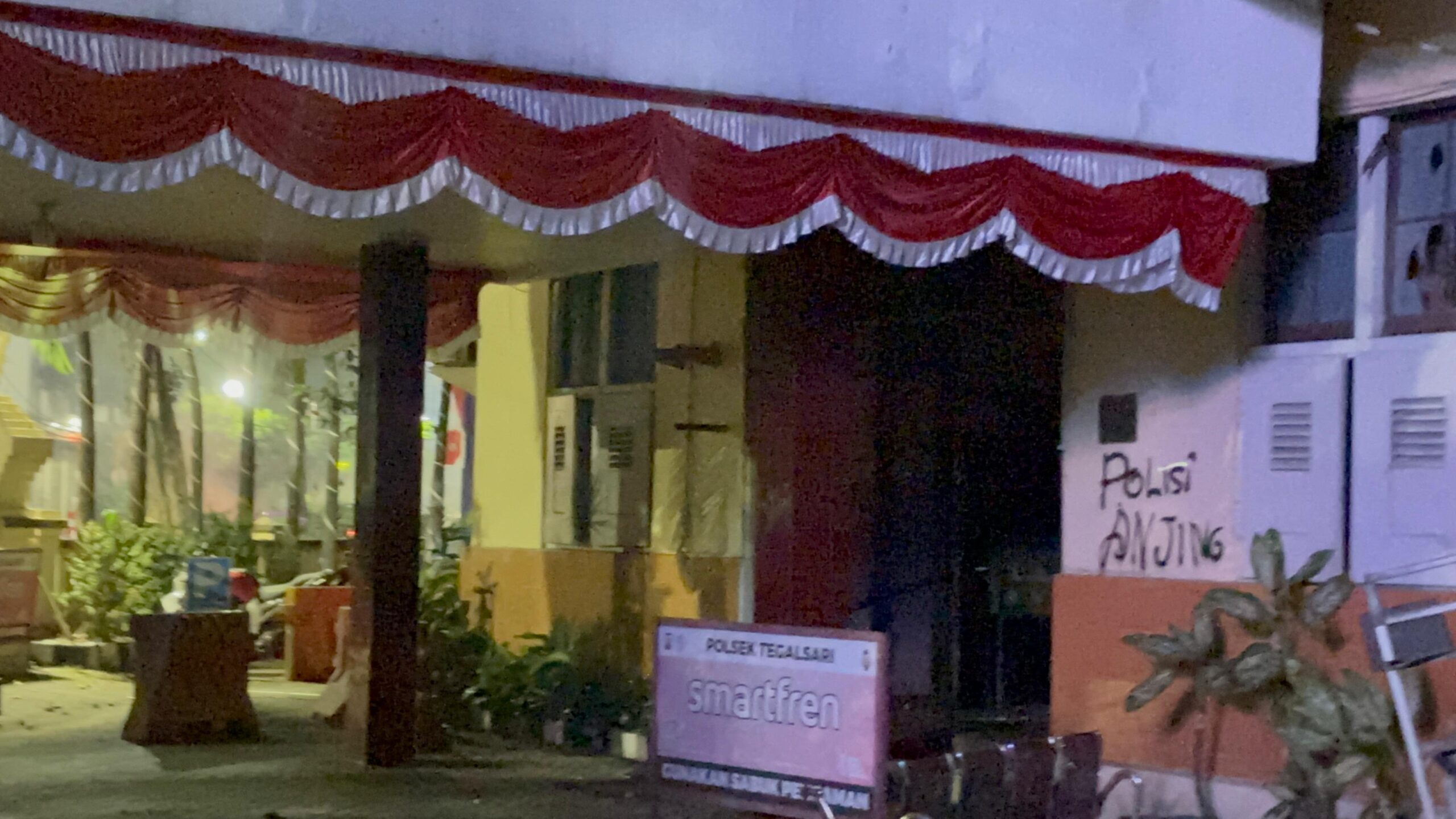 Sejumlah fasilitas di kantor Polsek Tegalsari mengalami kerusakan. Dinding bagian depan penuh coretan vandalisme akibat ulah massa yang tidak terkendali.