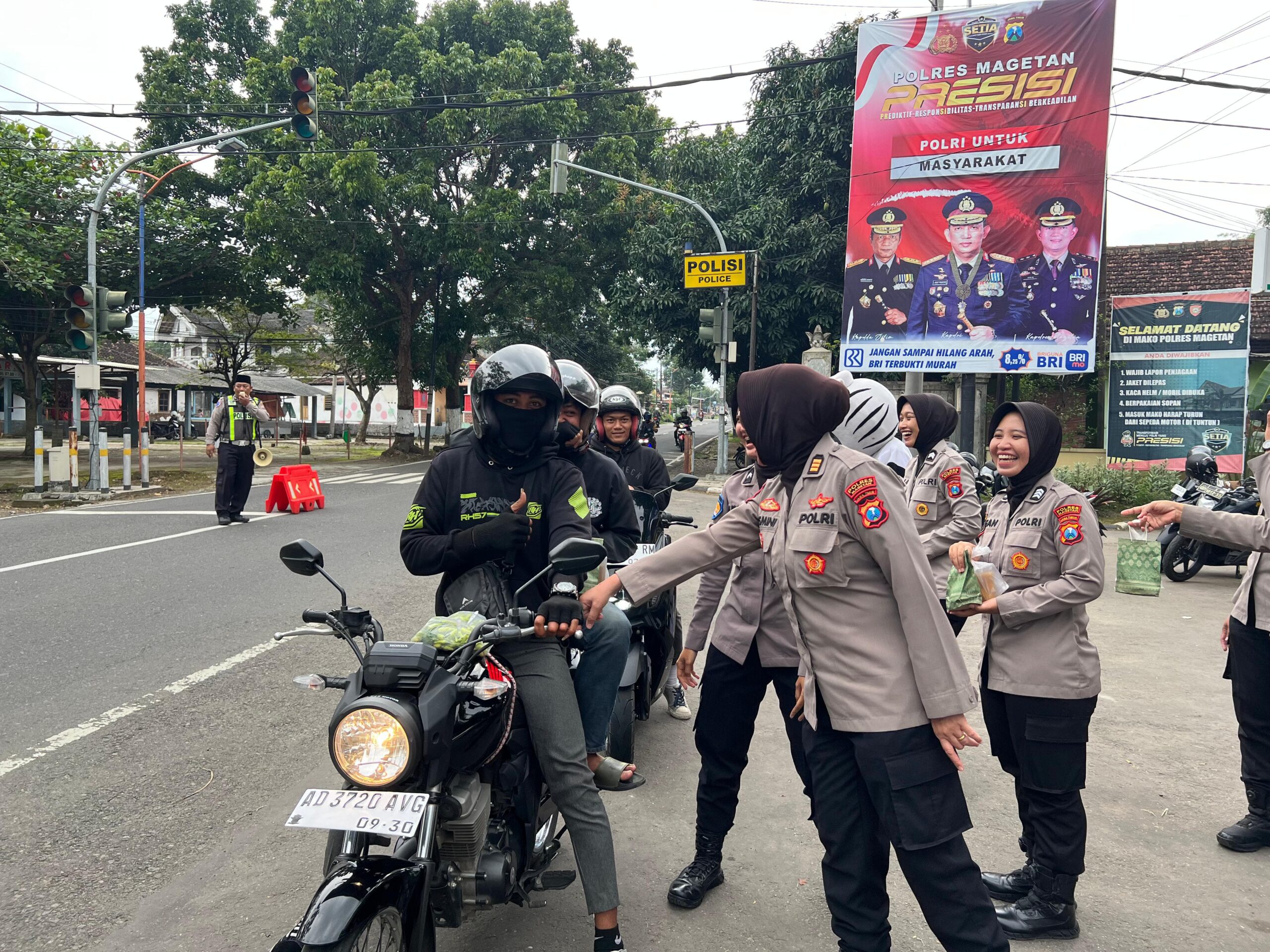 Sejak sore hari, para Polwan tampak membagikan paket takjil kepada pengendara roda dua maupun roda empat dengan penuh senyum dan semangat kebersamaan.