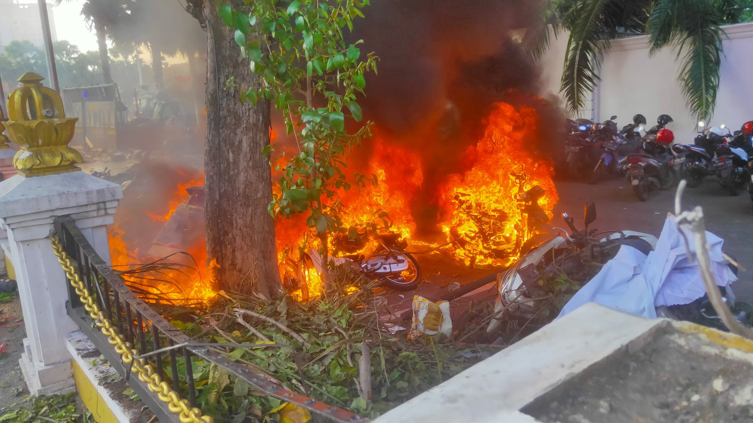 Di area parkir timur dekat pos penjagaan, beberapa sepeda motor terbakar. Asap hitam mengepul ke udara. Dari informasi yang dihimpun, setidaknya ada 12 unit sepeda motor yang terbakar. Seluruhnya merupakan kendaraan milik karyawan dan Satpol PP Provinsi Jawa Timur.