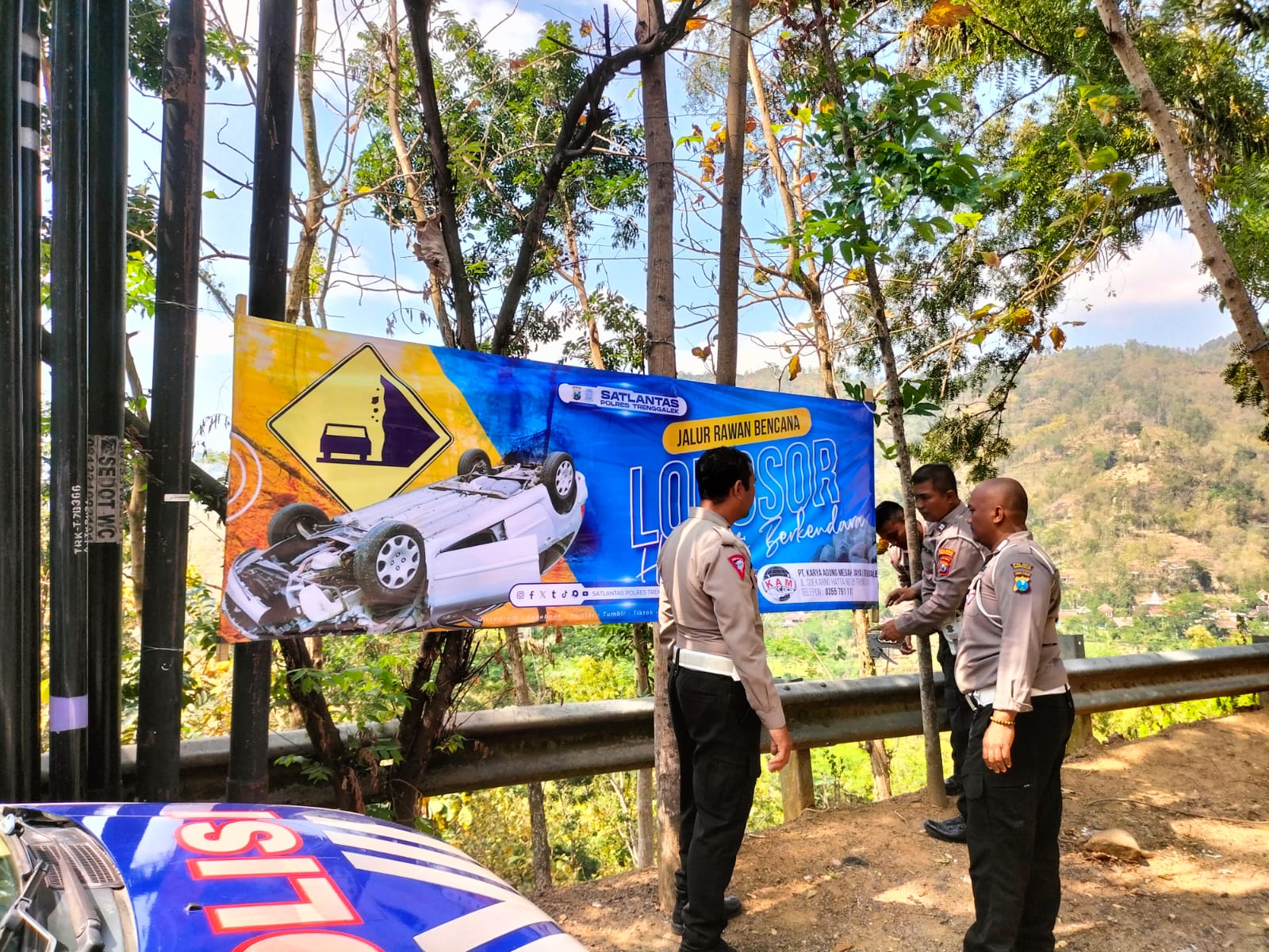 Spanduk peringatan tersebut dipasang di KM 15 pada posisi strategis, sehingga mudah dilihat oleh pengendara dari arah Trenggalek maupun Ponorogo. Selain peringatan rawan longsor, spanduk yang dipasang juga mengedukasi tentang pentingnya tertib berlalu lintas.