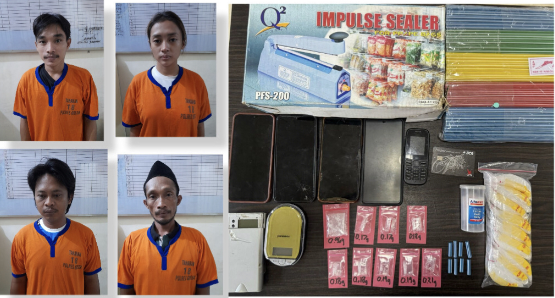 Satreskoba Polres Gresik berhasil mengamankan empat tersangka sekaligus yang masih memiliki hubungan keluarga. Mereka kompak menjadi pengguna sekaligus pengedar barang haram di wilayah hukum Kabupaten Gresik.