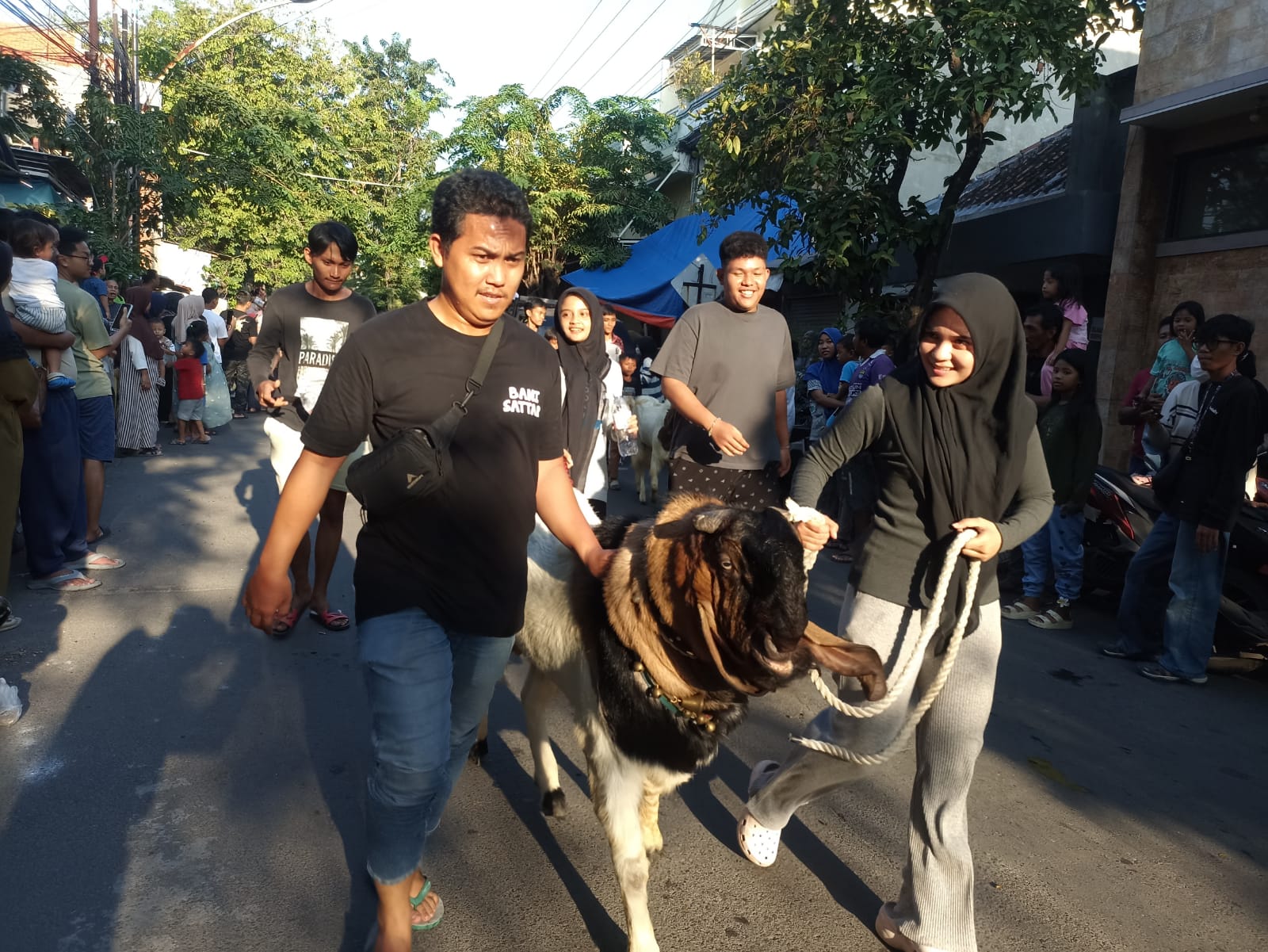 Salah satu peserta, Muhammad Bagas Wicaksono, siswa kelas 2 SMP, datang dengan penuh semangat membawa kambing super jumbo milik kakaknya. “Senang sekali bisa ikut. Ini bikin Iduladha jadi seru dan lebih bermakna,” katanya dengan senyum malu-malu namun mata yang berbinar.