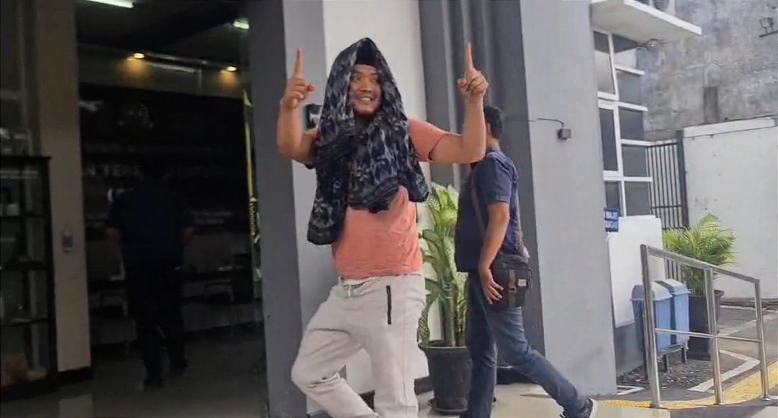 Edo tiba di Kantor Kejaksaan Negeri (Kejari) Kabupaten Mojokerto pada pukul 12.45 WIB. Saat itu, ia mengenakan kaos berwarna merah muda, celana krem, dan sarung yang menutupi kepalanya.