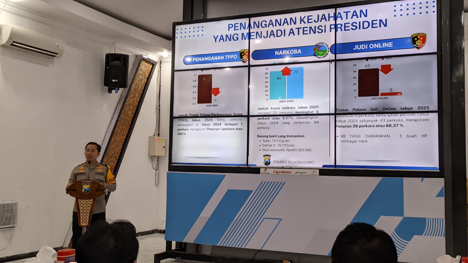 Kapolres Bojonegoro AKBP Afrian Satya Permadi mengatakan, penurunan jumlah tersangka kasus judi online pada 2025 cukup drastis jika dibandingkan dengan tahun 2024. Hal itu disampaikannya saat konferensi pers akhir tahun di Gedung Rawi Polres Bojonegoro, Senin (29/12).