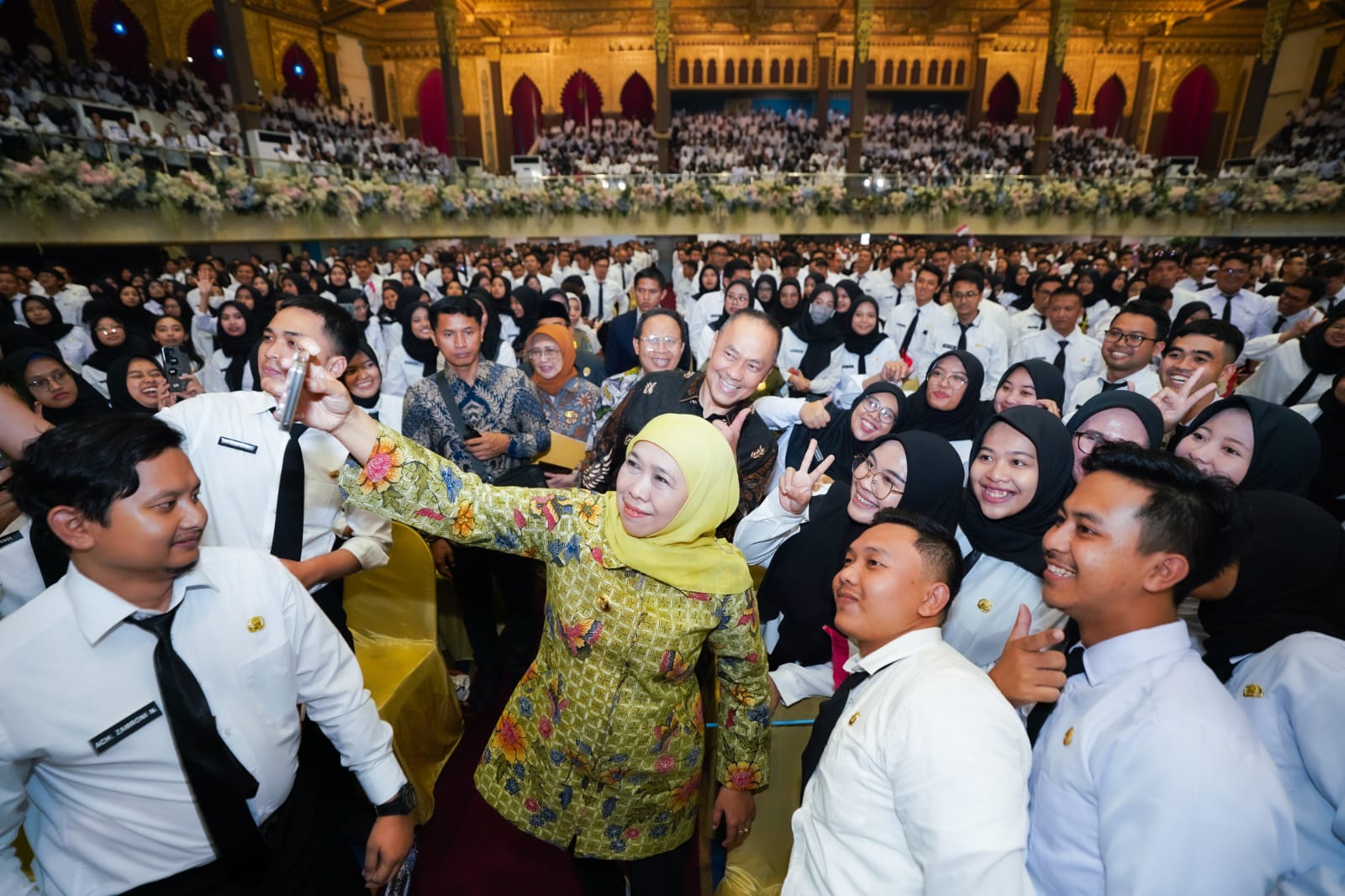 Acara ini turut dihadiri Ketua Komisi A DPRD Jatim Dedi Irwansah, Plt. Asisten Administrasi Umum Setdaprov Jatim Akh. Jazuli, jajaran Kepala Perangkat Daerah Provinsi Jatim, serta ribuan CPNS dan PPPK baru.