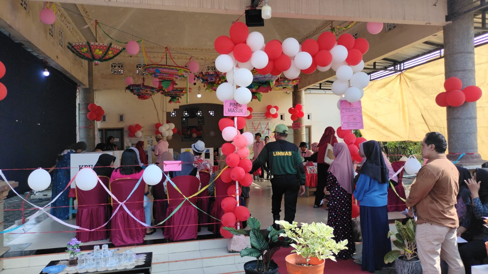 Pernak – pernik dan ornamen balon berwarna pink, putih hingga merah menghiasi TPS 4 Dapet, Rabu (14/2/2024). Sejak pagi, suasana di sekitar TPS menjadi semakin sibuk dengan persiapan terakhir yang dilakukan KPPS.