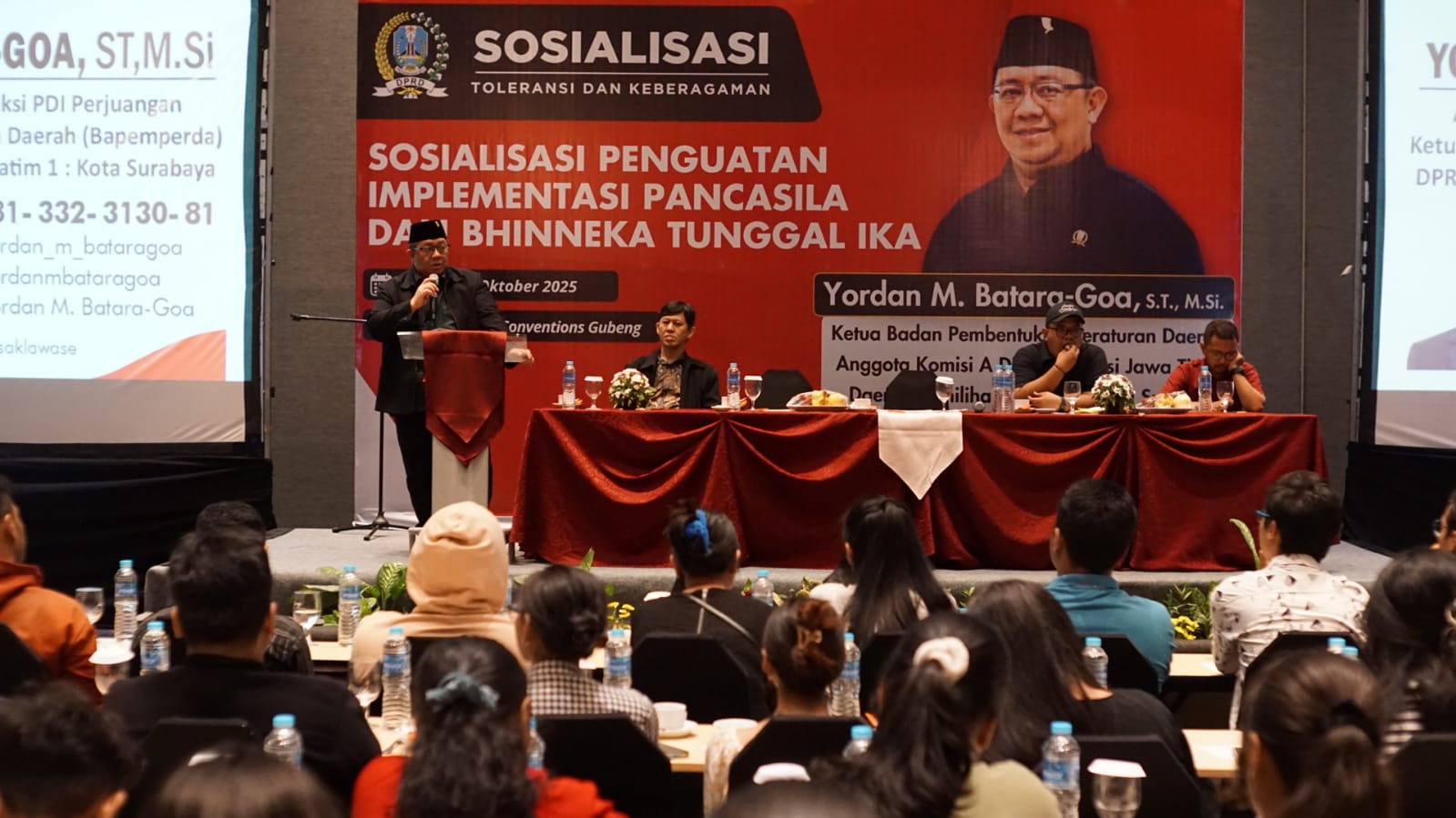 Hal itu disampaikan Yordan dalam kegiatan Sosialisasi Toleransi dan Keberagaman bertema “Sosialisasi Penguatan Implementasi Pancasila dan Bhinneka Tunggal Ika” di Harris Hotel & Conventions Gubeng, Jumat (17/10) malam.