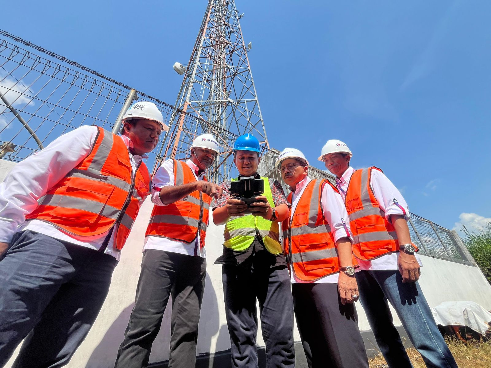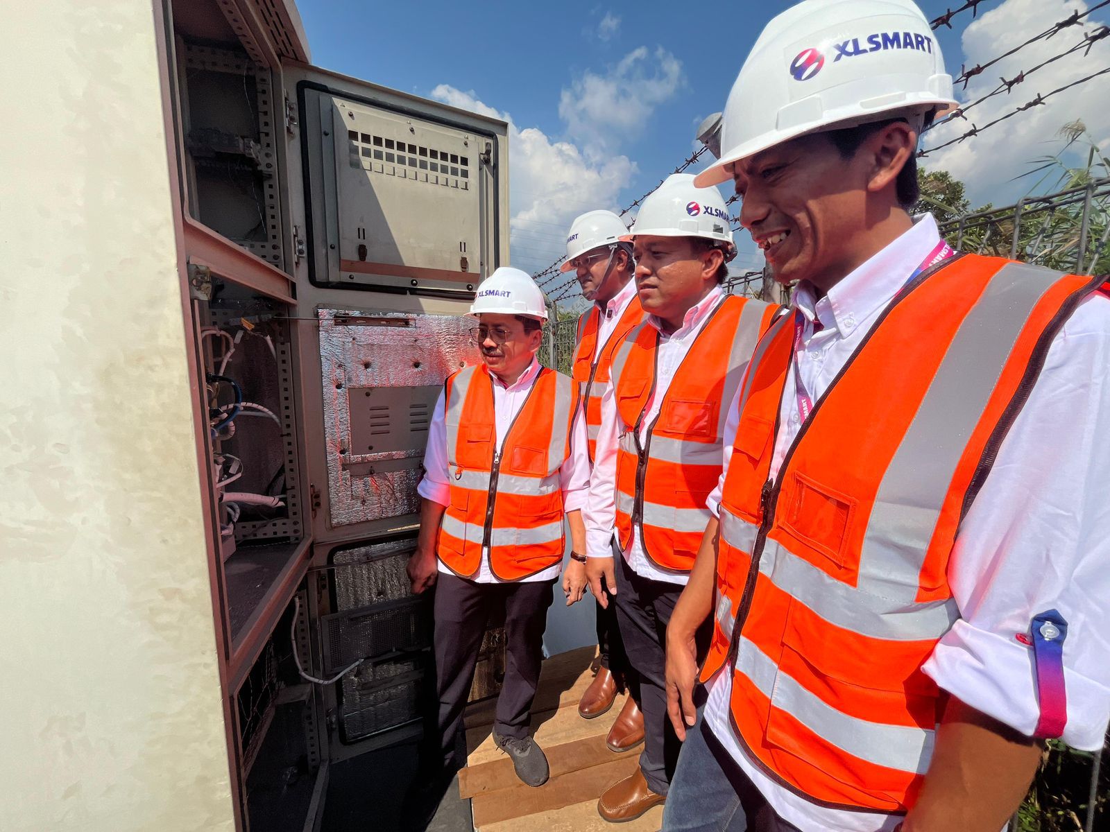 Direktur & Chief People Officer XLSMART, Jeremiah Ratadhi (kiri pertama), Direktur & Chief Technology Officer XLSMART, Shurish Subbramaniam (kiri kedua), Direktur & Chief Regulatory Officer XLSMART, Merza Fachys (kanan kedua), dan Regional Technical Lead Kalimantan XLSMART, Dedik Sulistiyono, melakukan pengecekan salah satu perangkat Base Transceiver Station (BTS) milik XLSMART yang berlokasi di Jl. Pemajatan, Kecamatan Gambut, Kabupaten Banjar, Kalimantan Selatan.